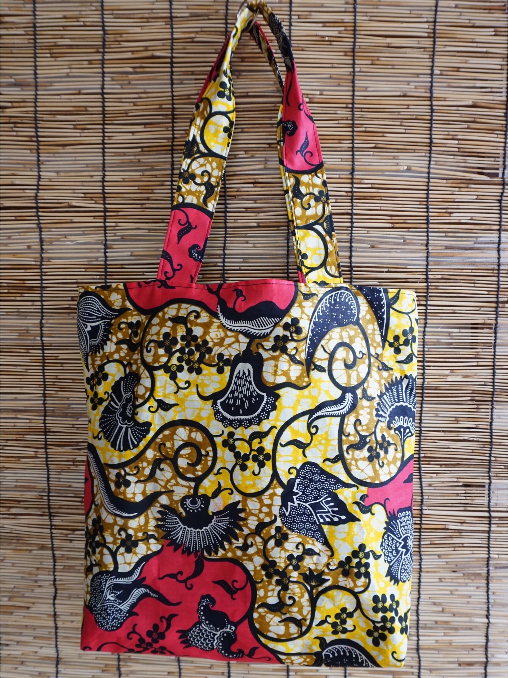 ざっくり荷物を入れられる、アフリカンバティックの柄を生かした