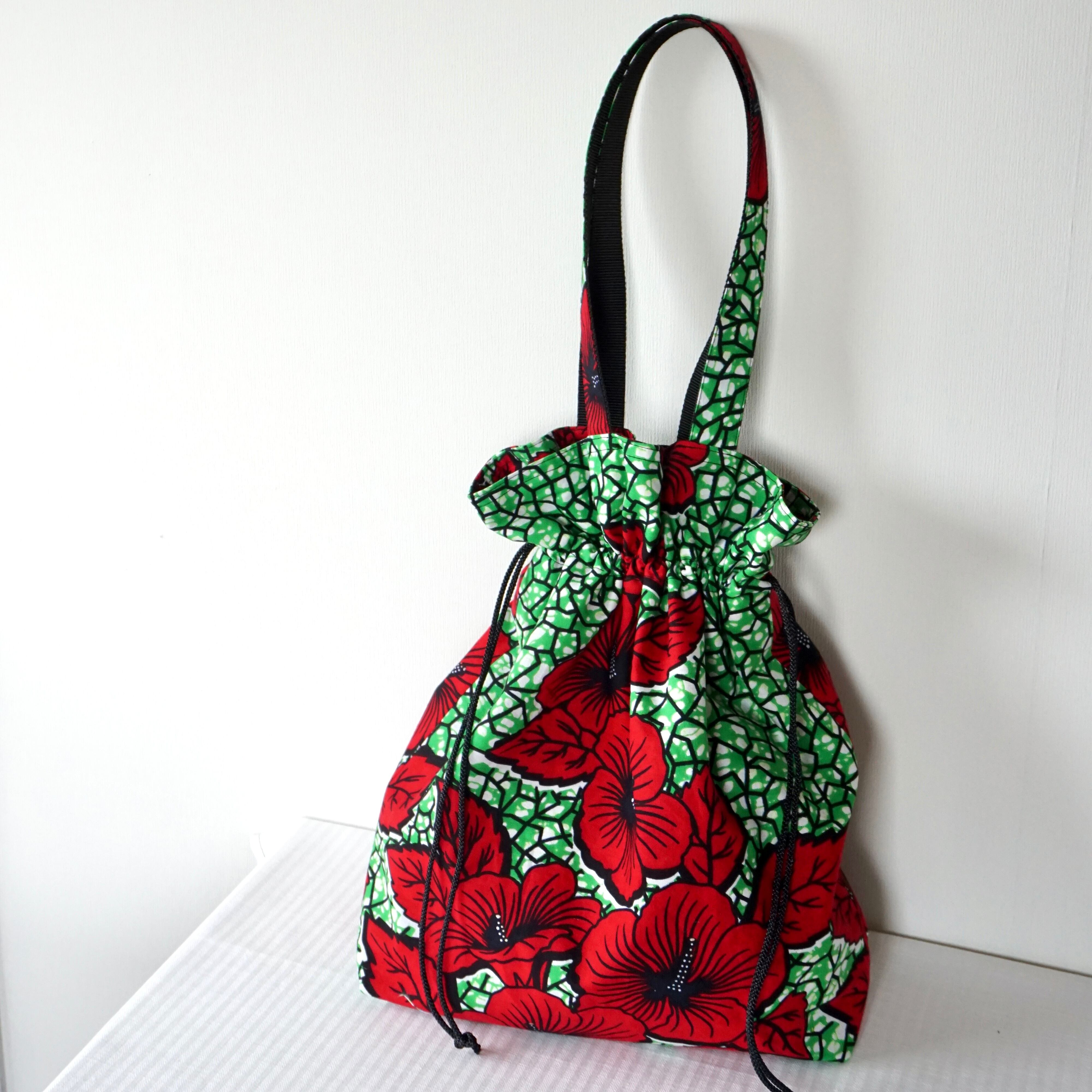 たっぷり大容量&中仕切りあり【アフリカン巾着トートバッグ/ハイビスカス】エコバッグにも♪