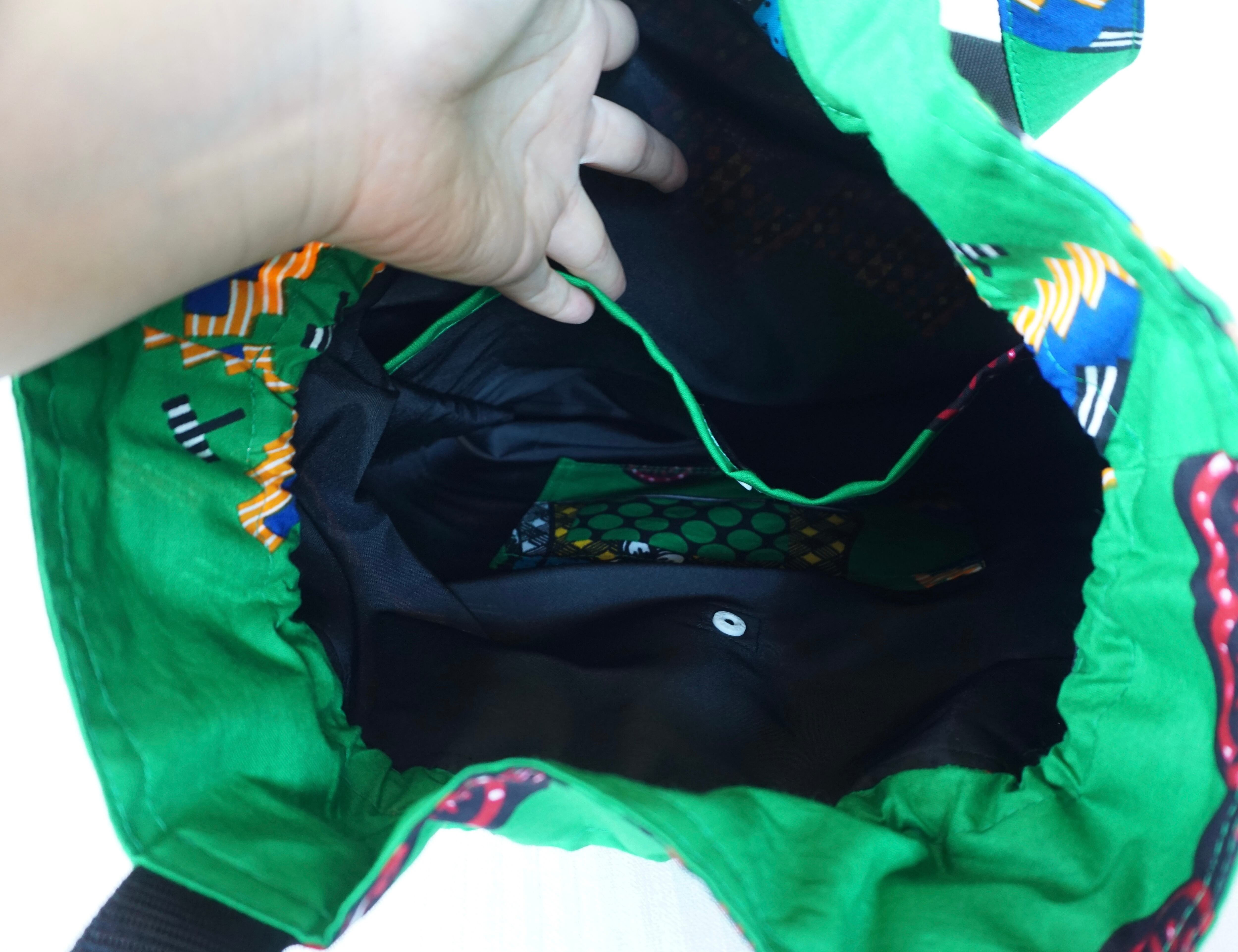 【中に仕切りがある大きめアフリカ布の巾着トートバッグ/グリーン柄】エコバッグにも♪